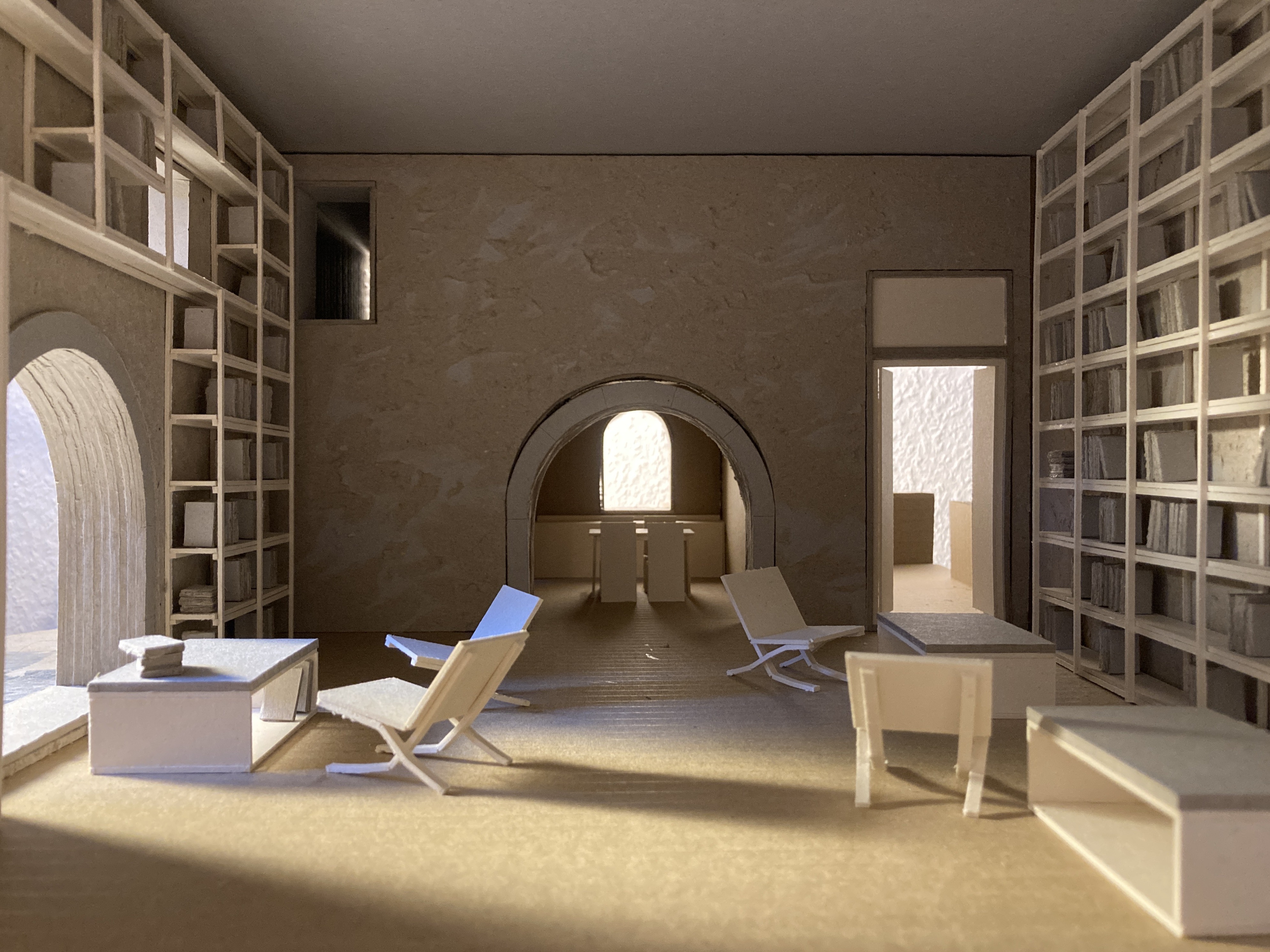 The library finds its place in the largest room of the existing building, which also can be opened directly to the street. This size of space is rare in Caporciano and therefore should not be obstructed. The books are lo-cated in high shelves on all exterior walls, so they do not block any floor space, they are aesthetically pleasing and provide additional thermal in-sulation. There is also a gap between the exterior wall and the shelving, which is necessary to protect the books from humidity due to the fact that most of the existing walls are permeable.
